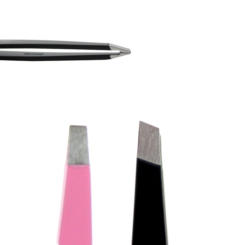 - PROFESSIONAL QUALITY Grooming Set featuring a Black Stainless Steel Slant Tip Tweezers, Pink Straight Tip Tweezers, plus BONUS Spoolie Eyebrow Brush. Receiving 2 for the price of one allows you to leave one at home, and keep one in the office for those stubborn hairs that pop up during the day!
