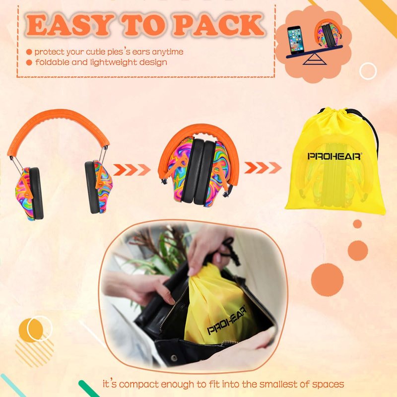 - [Compact & Travel-Friendly] Say goodbye to meltdowns. The adjustable headband and 360° rotatable cups allow you to fold the earmuffs into a compact size, fitting even the smallest spaces. A travel drawstring bag is included for your convenience