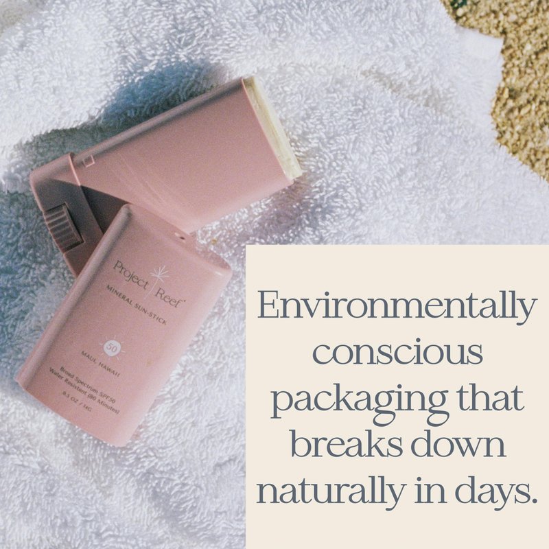 Our sunstick packaging is made with Eco Smart, Earth Friendly plastic that biodegrades in days, not decades. It's not just safe, but also recyclable. The key ingredients of this sunscreen bar include Non-Nano Zinc, Shea butter, Coconut Oil, and Vitamin E. These ingredients work together to provide effective protection against harmful UV rays. So whether you're planning a beach trip or just stepping out for a walk, our sunscreen stick is your perfect travel companion. It's time to redefine your sun care routine with Project Reef Sunstick.