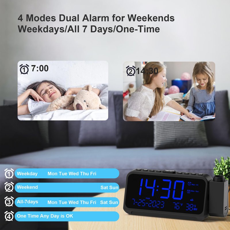 Projection Alarm Clock for Bedroom with Weekday/Weekend Mode,Digital Clock with 350° Projector,5-Level Dimmer,Adjustable Volume,Temperature & Humidity Monitor,Calendar,Snooze,12/24H,DST,Battery Backup