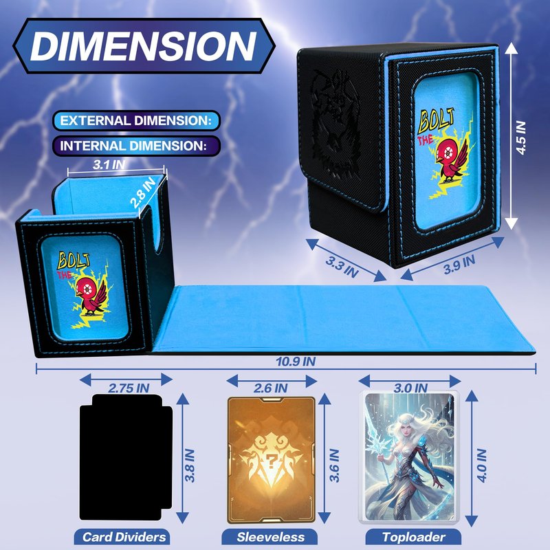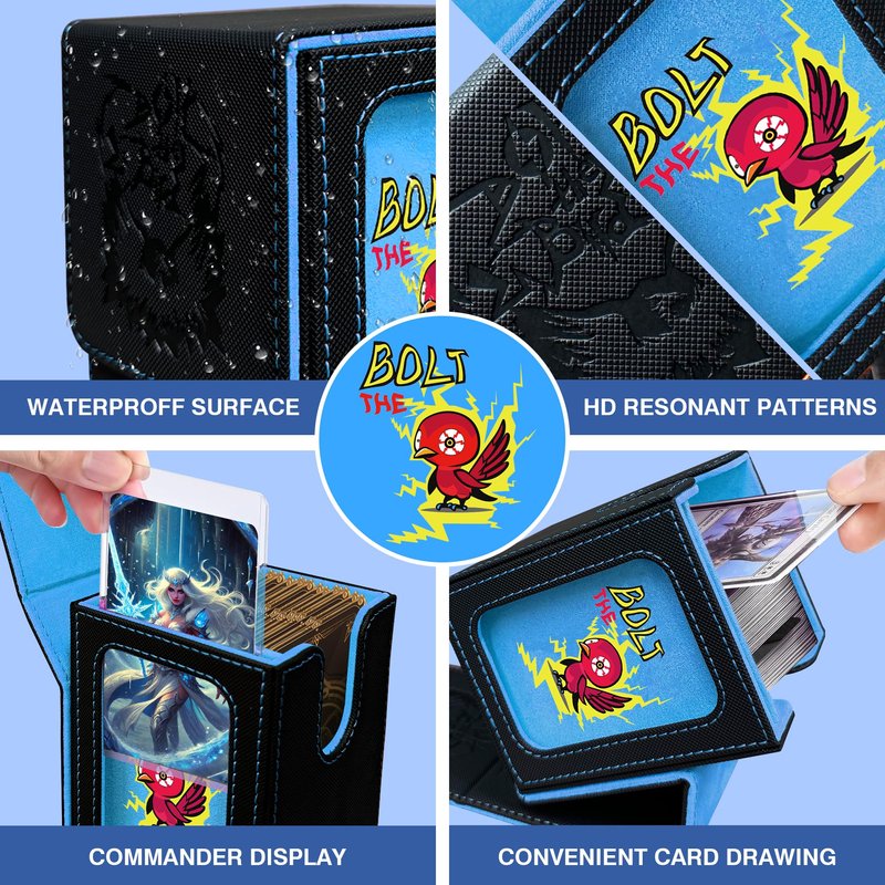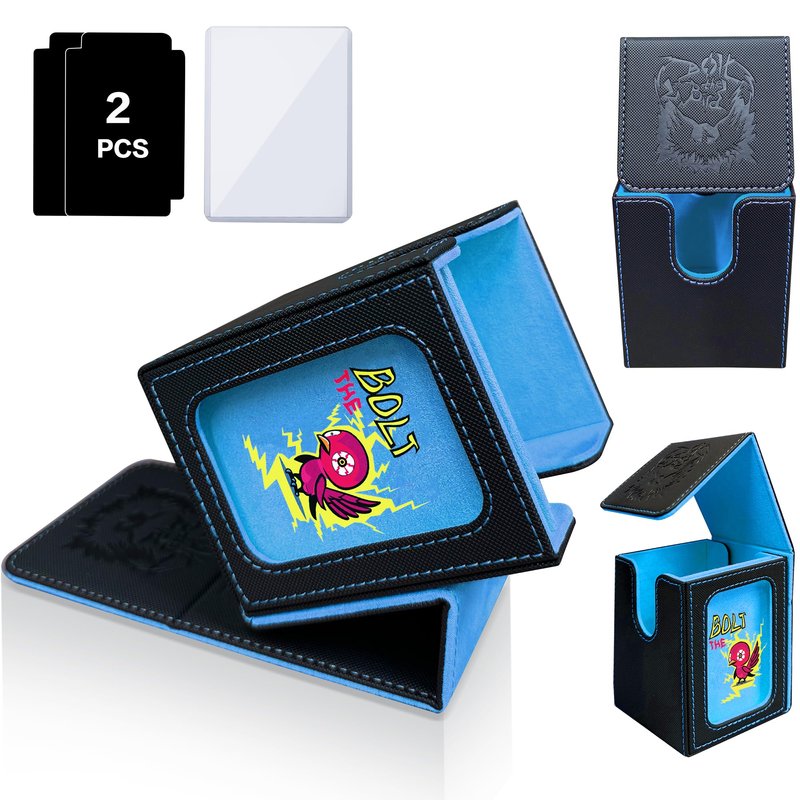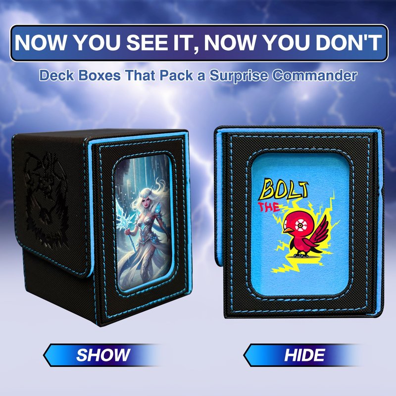 - Stunning Visual Design: Experience the artistry of the PROMAXIBINDER MTG deck box, inspired by the iconic Bolt the Birds. The redesigned cover offers a fresh and captivating look that will leave a lasting impression on all players. Innovative window design is perfect for EDH Commander players and versatile enough for Prime cards like Energy cards. The custom slots securely hold your Commander or Prime card in the included top loader for easy identification and display. The MTG deck box can also prop itself up with its lid for convenient access.