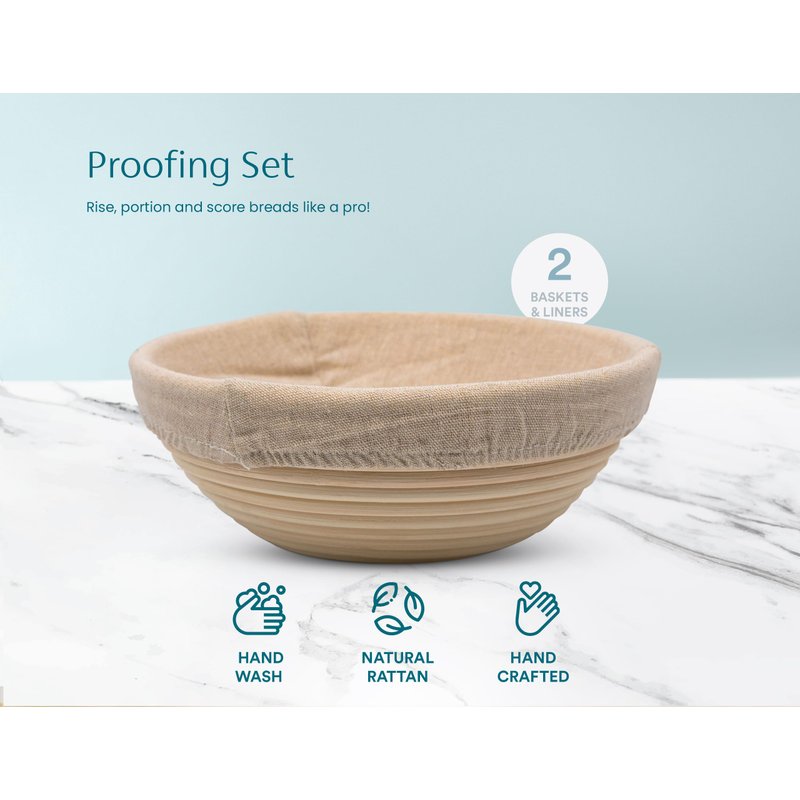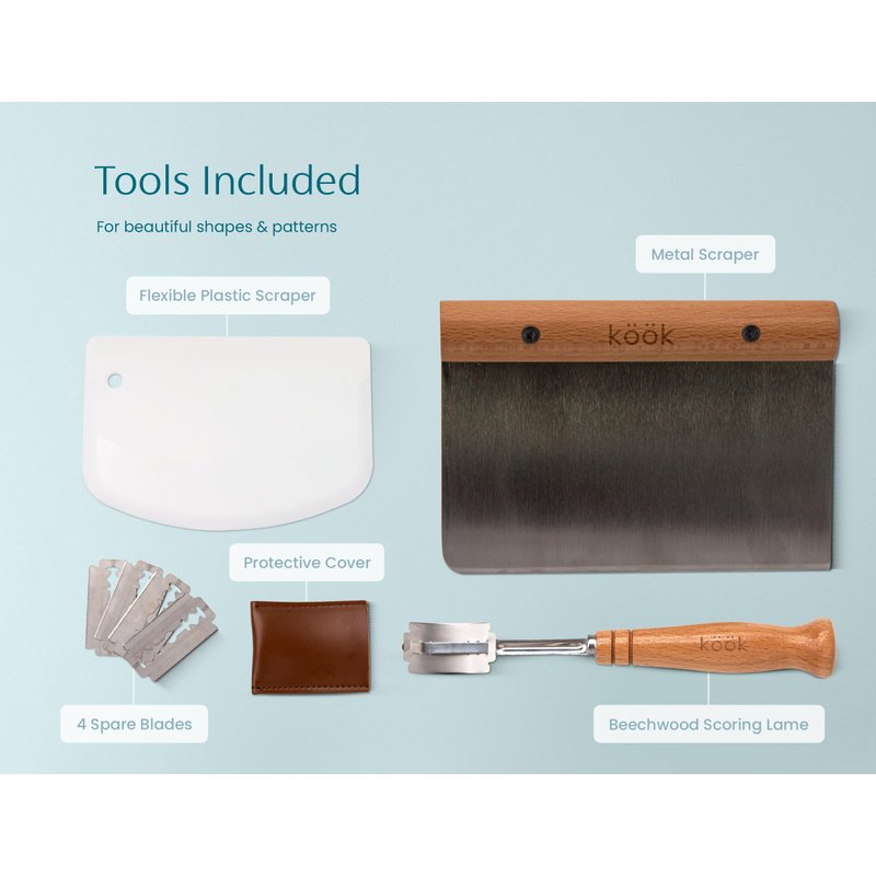 All the tools you need to rise, portion and score doughs like a pro. Includes 2 natural rattan baskets, bowls with liners, metal and plastic scrapers, a scoring lame with case, 4 spare blades, and a quick start guide. This kit is great for baking the perfect dough. Enjoy loaf after loaf of perfectly shaped, beautifully patterned, homemade breads!