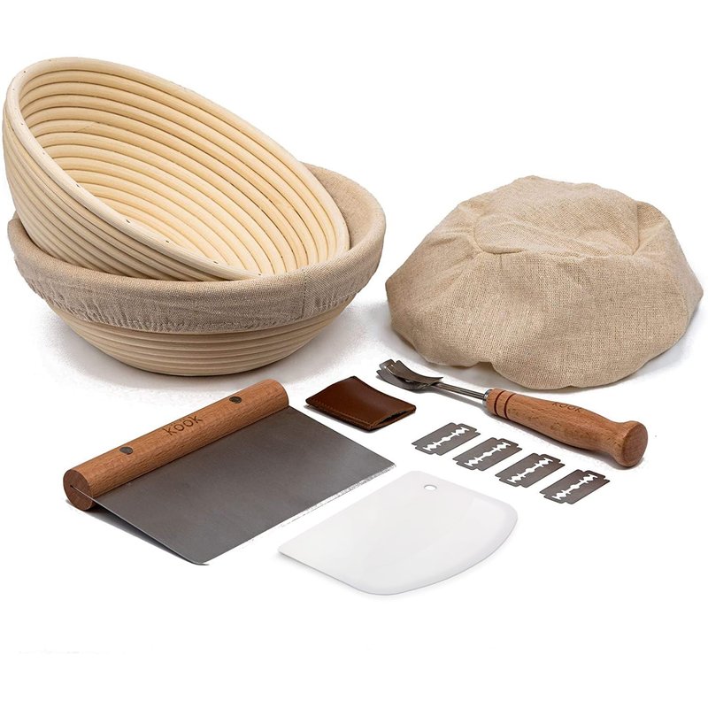 Proofing Set, by Kook, Sourdough Bread Baking Supplies, Sourdough Bread, 2 Rattan Banneton Baskets, 2 Basket Covers, Metal Scraper, Plastic Scraper, Scoring Lame, 5 Blades and Case, Baking Kit, Round