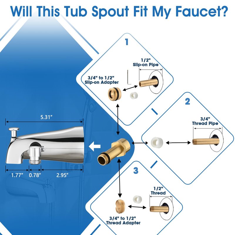 - EASY TO INSTALL - Bathtub spout with diverter is easy to install and can be fitted in just a few minutes. no need for a plumber or handyman. It includes an installation kit to help make the job stress free. 1-year warranty.