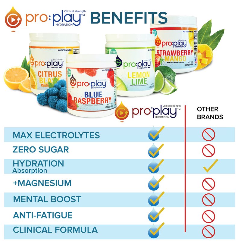 Hydration Health Products use a formula developed from 40 years of scientific research. With an isotonic delivery system, our products were designed to replace fluids in extreme situations where a medical IV isn't available. Our mission is to improve and support the condition of active people and athletes by combating dehydration in their activities and defending them in heat stressed environments. We will advance the science of hydration and bring forward products that will support and improve the user at the gym, playing field or workplace. Hydration Stats 1 % dehydration decreases worker productivity by 12% 2 % dehydration increases your Heart Rate by 5bpm 3 % dehydration decreases cardiac output by 20% and reduces reaction time by 17%. 3% dehydration is equivalent to having a Blood Alcohol content of.08 making you 5x more likely to be in a motor vehicle accident. You can stay strong with pro:play’s 916mg of electrolytes (3x more than leading sports beverage), L-Glutamine (almost 2 grams per serving), and 25 mg of Magnesium Citrate that prevents cramps. Comes in stick packs with easy pour spout and 40 serving tub with scoopie (funnel scoop). Our best tasting product! This is the product we push in industrial applications.