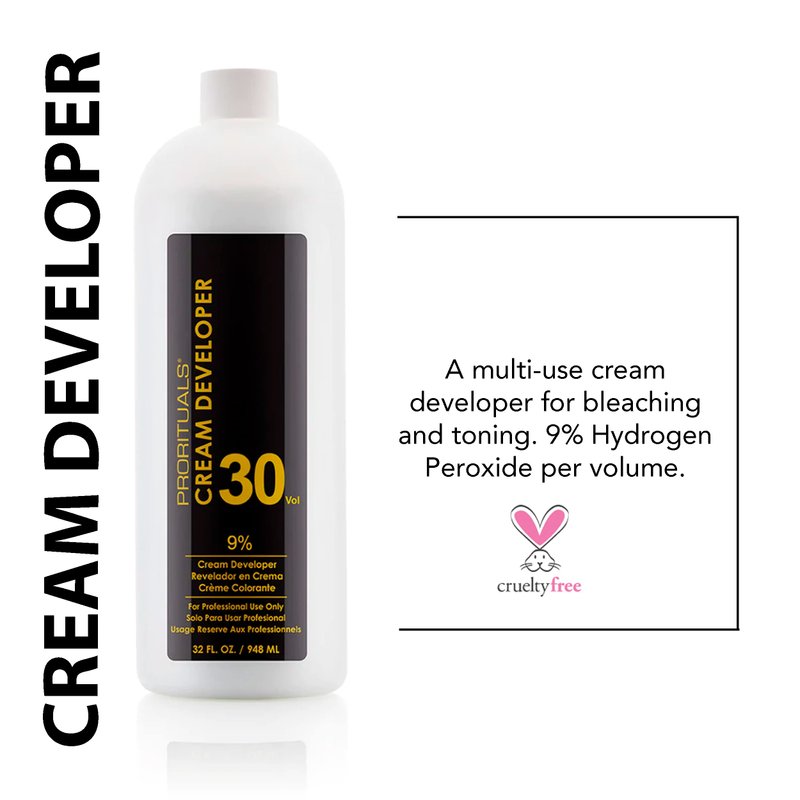 - Cream Developer A multi-use cream developer for bleaching and toning. 9% Hydrogen Peroxide per volume. Completely vegan and 100% cruelty-free, never tested on animals.