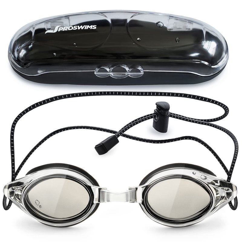 Proswims Anti-Fog Racing Swimming Goggles Gray Lens with Quick Adjustable Elastic Bungee Strap, Hard Case and Bonus Swim Goggles Microfiber Cleaning Cloth