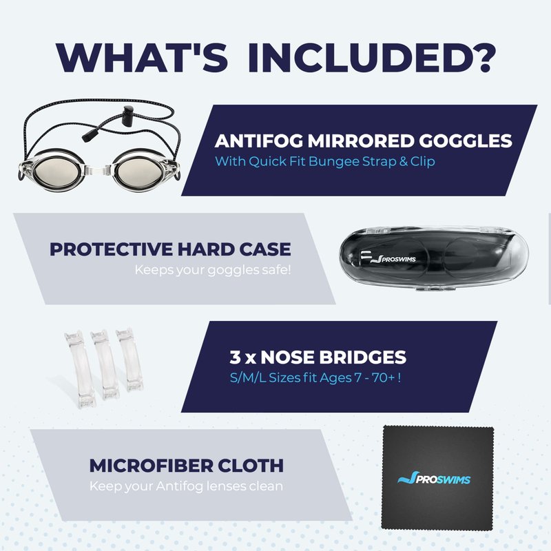 - Proswims professional swim goggles feature the softest silicon gasket we could find, giving you the most comfortable fit & an air-tight leak-proof seal. Not only that but our goggles come with a high quality protective hard case, to keep your goggles safe, and scratch free. For a limited time only we have included a free Bonus Proswims microfiber cleaning cloth to wipe down your goggles and keep them clean & free of water.