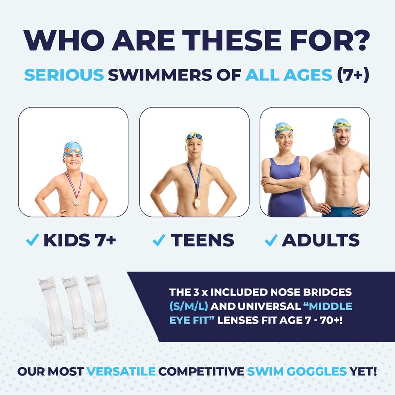 - INCLUDED NOSE BRIDGES FIT AGE 7 & UP, AND NEVER BREAK - Featuring a high nose bridge and 3 interchangeable, super tough, nose pieces, these goggles are guaranteed to fit ages 7 and up. These are suitable competition level sports goggles for adults and teenagers.