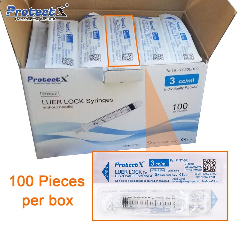 ProtectX 3ml Disposable Luer Lock Sterile Syringe (No needle), Individually Sealed, Smooth and Accurate Dispensing for Science Labs, 100-Pack
