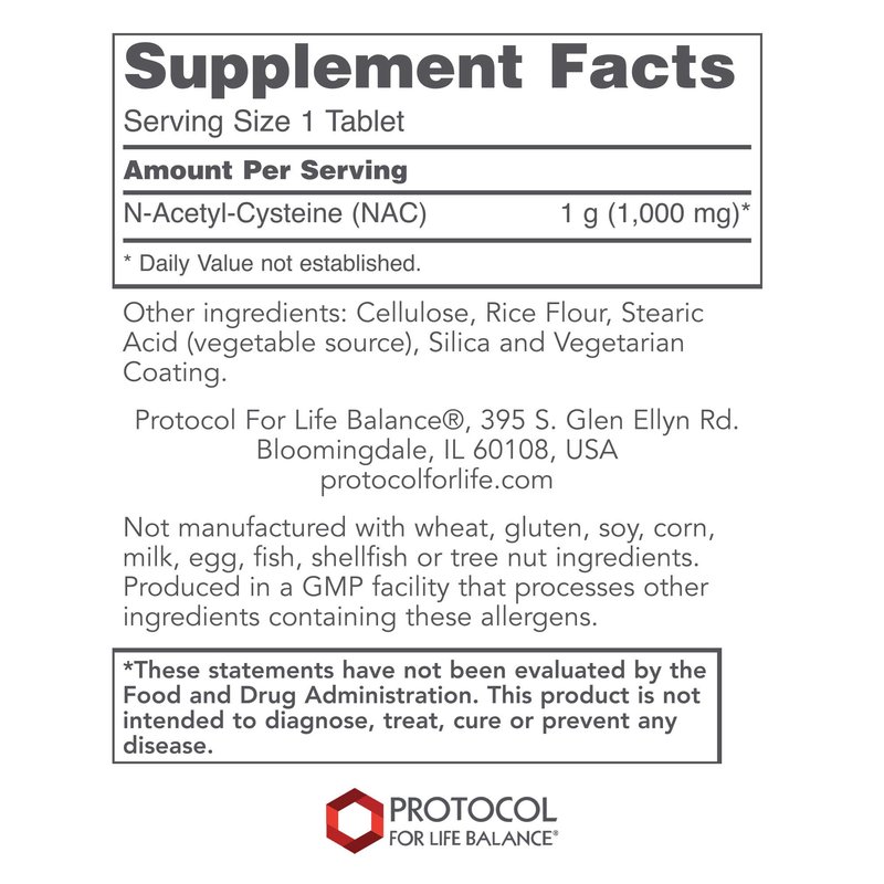 Protocol for Life Balance NAC 1,000mg is a meticulously crafted supplement that is a stable and bioactive form of cysteine. This NAC 1,000mg provides a crucial amino acid and aids in phase II detoxification and homocysteine metabolism.* NAC is efficiently transported within cells where it is converted to cysteine, necessary for glutathione synthesis and regeneration.*