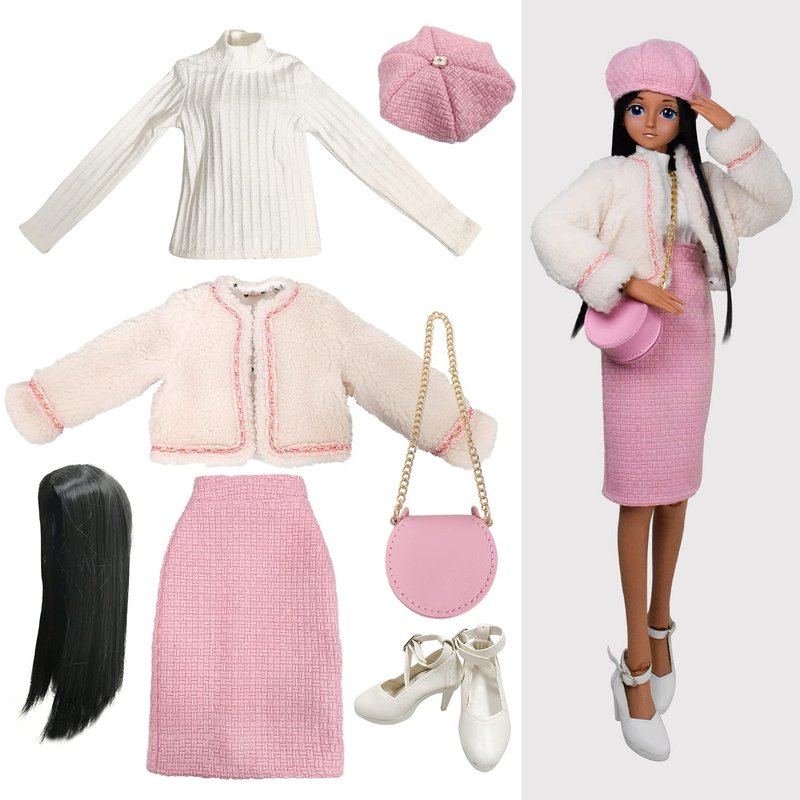 - Package: Beret + Wig + Jacket + Pencil Skirt + Long-Sleeve Shirt + Crossbody Bag + Shoes (No doll included)