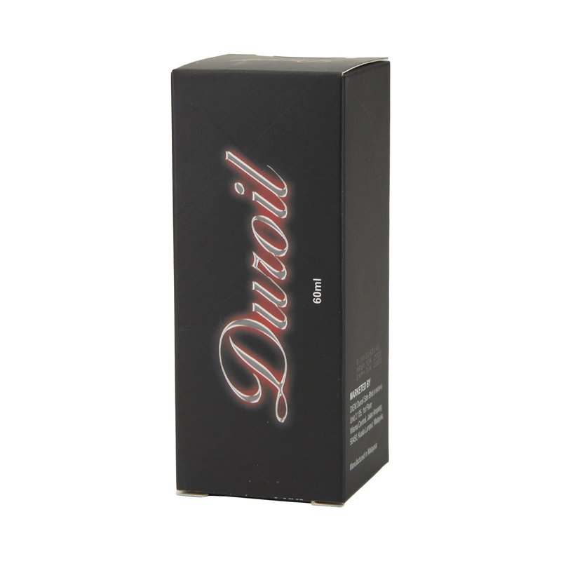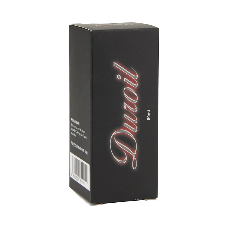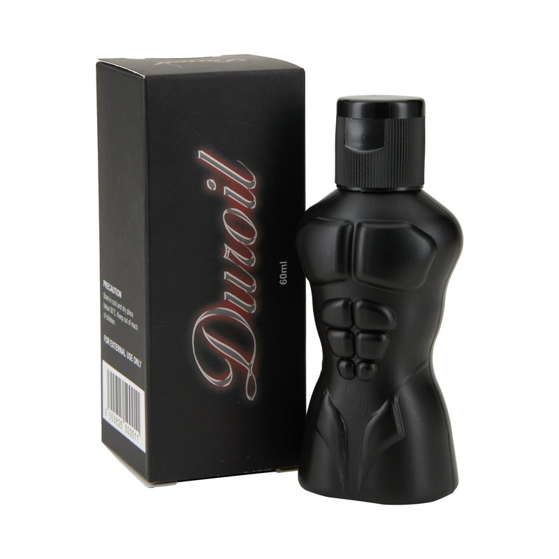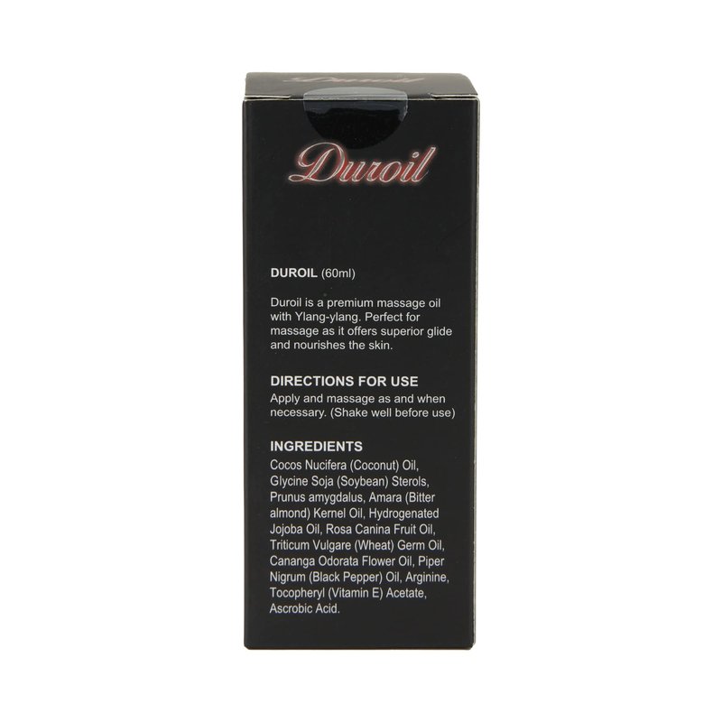 DUROIL - 60ml is manhood and intimate skincare massage oil for men. It is made of a blend of natural oils. It is suitable for use by way of self-massage. Using this oil there is no need for a deep massage. Just apply gentle pressure and perform the massage strokes. Repeat and re-apply the oil for added hydration and moisture. Apply DUROIL - 60ml onto the skin and experience the difference! DUROIL is a sweet, masculine blend of botanicals, spices, and herbs infused with coconut and western oils. The massage oil contains botanical and plants extracts that may improve skin health by way of external application. Infused with the essential oil of Ylang-ylang. It offers a soothing yet invigorating scent that enhances the total massage experience. The synergy of natural oils and botanicals is effective to soften and improve skin making skin appear hydrated and young.