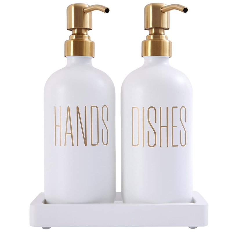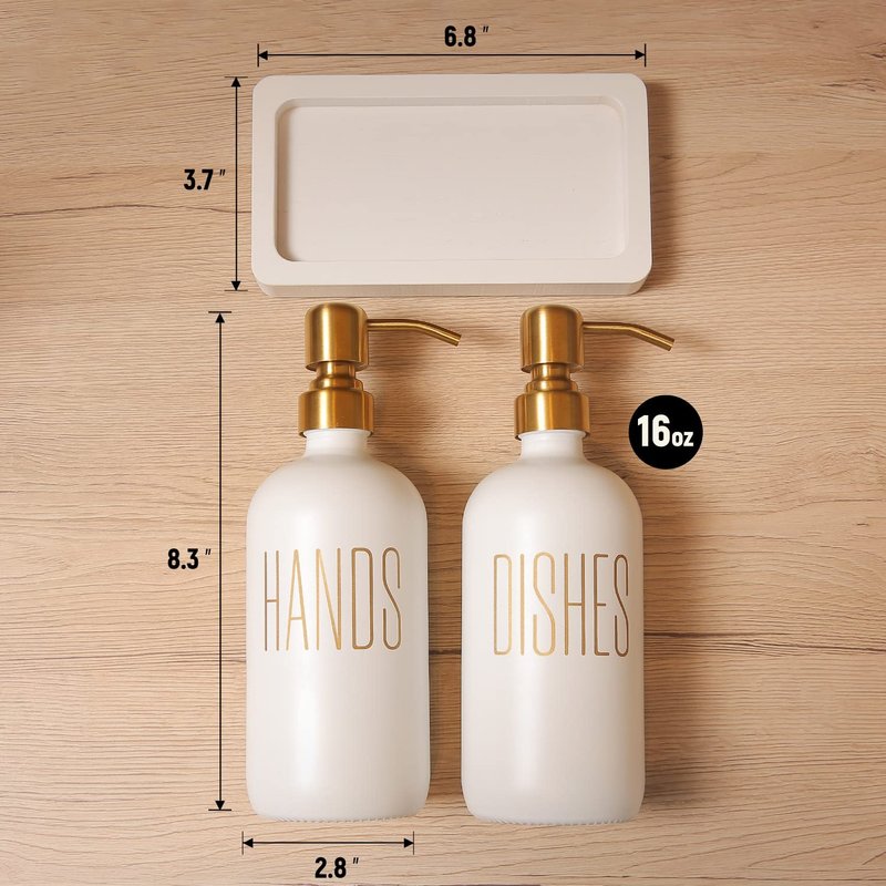 - [Labelled Soap Dispenser] The soap dispensers come pre-labeled as “HANDS” and “DISHES” to avoid confusion for anyone who uses them. This glass soap dispenser with pump is suitable for farmhouse decor and is an excellent gold kitchen accessories.