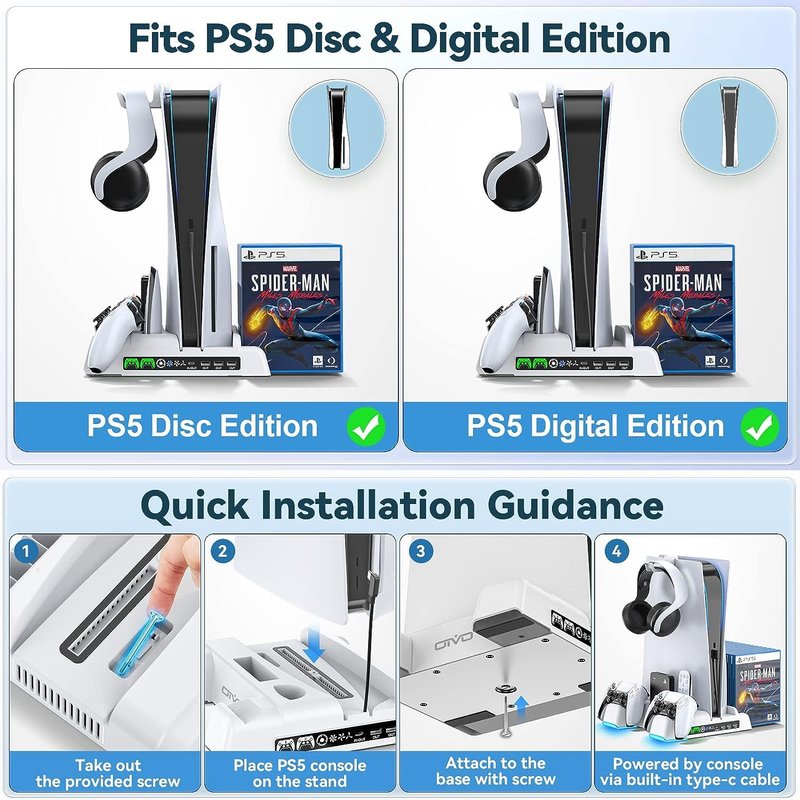 - 💠【Multifunctional Design for Playstation 5 Digital Edition & Disc Edition Consoles】This stand for ps5 is suitable for both ps5 console digital edition as ps5 console disc version.Comes with a screw to lock your ps5 console that keeping it secure and balanced,And the whole white color also matches the aesthetic of playstation 5 console. A perfect ps5 storage expansion charging dock to safely store dual sony dualsense controllers and display all ps5 assecories and console.