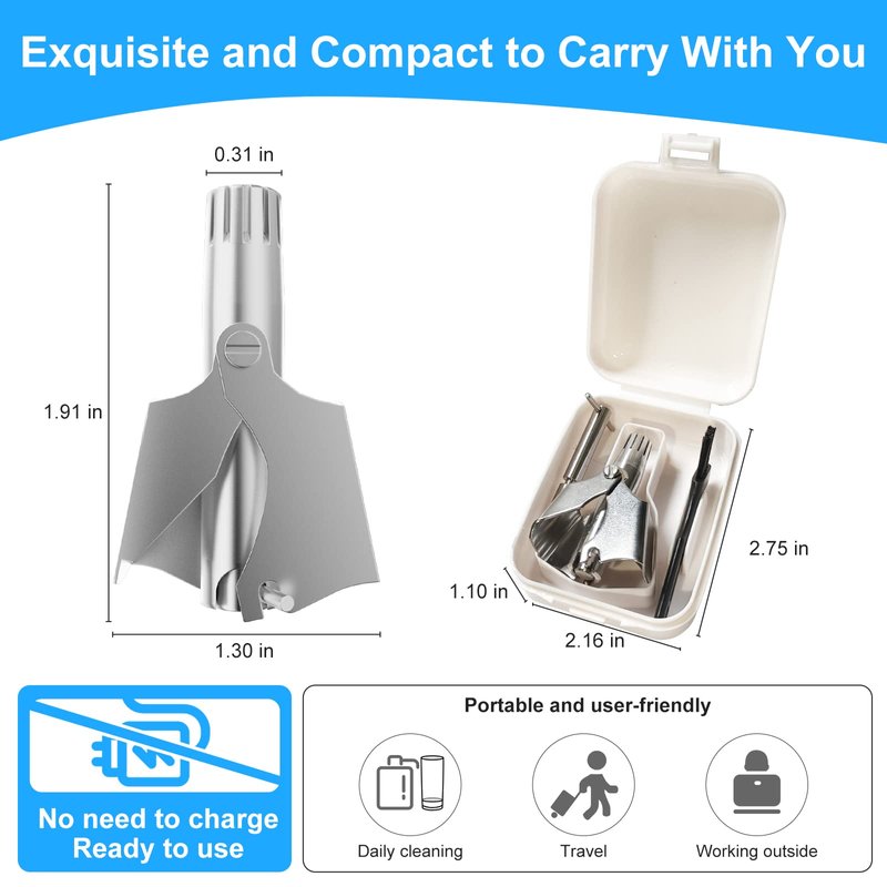 Moreover, the portable design of the Psarnuk Nose Hair Trimmer makes it your beauty companion anytime, anywhere. It operates without batteries, relying solely on manual operation, eliminating the hassle of battery replacement. Its compact size and lightweight nature make it easy to carry, whether for home use or while traveling, fulfilling your trimming needs.