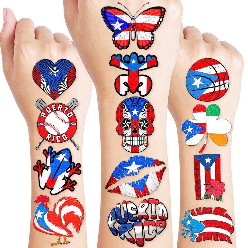 - The set of Cute Puerto Rico temporary tattoos are made of high quality safety and green paper, and totally safe for your kid's skin. Simply wet the tattoo with water and stick transferred them onto your body, hands, faces and arm you like, Tattoos will last 3-5 days, it also can be easily removed with baby oil, makeup remover or rubbing alcohol.