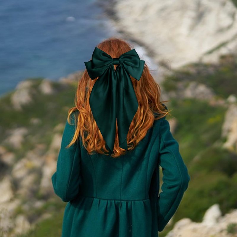 Pufandor Hair Bow Silky Satin Hair Ribbons for Women, Green Bows for Girls Hair Bowknot Barrettes Long Tails with Clips Big Hair Bows Hair Accessories (Dark Green 1pc)