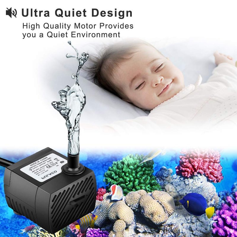 - ★【Ultra Quiet Design】: The relible and duarable motor does not produce much noise, giving you quiet environment.This submersible pump is designed for small to medium size aquarium, Fish tank, Pond, tabletop fountains, water gardens and hydroponic systems.