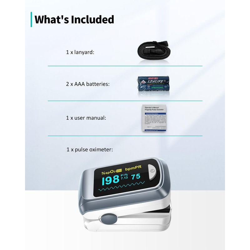 - You will get:1x bluetooth pulse oximeter, 2 x aaa batteries, 1x lanyard, 1x user manual