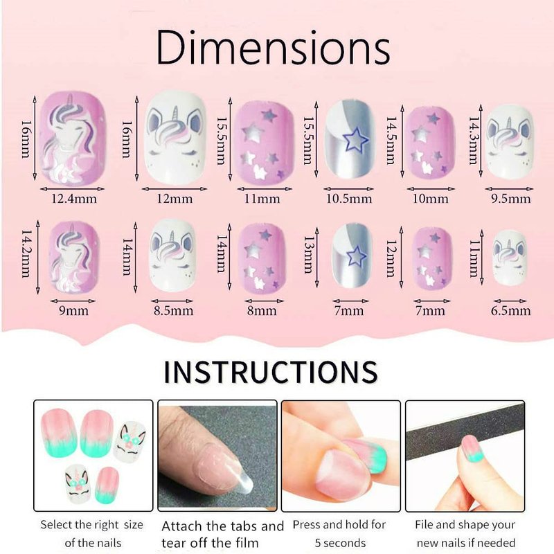 - Assorted Girls Fake Nails Size:Press on fake nail tips includes 12 different size, fits for most kids and girls ages 7-12, to meet the need of different age girls nail art decoration need and create a beautiful nail art.