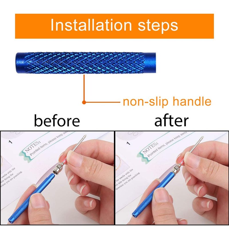 - High Quality: This stitching punch needle set is made of high-quality material, a non-slip handle, and one metal handle, durable for use. Needle tips just push into the handle. It can be used without the handle as well. A good-quality punch needle threader is also included for easy threading.