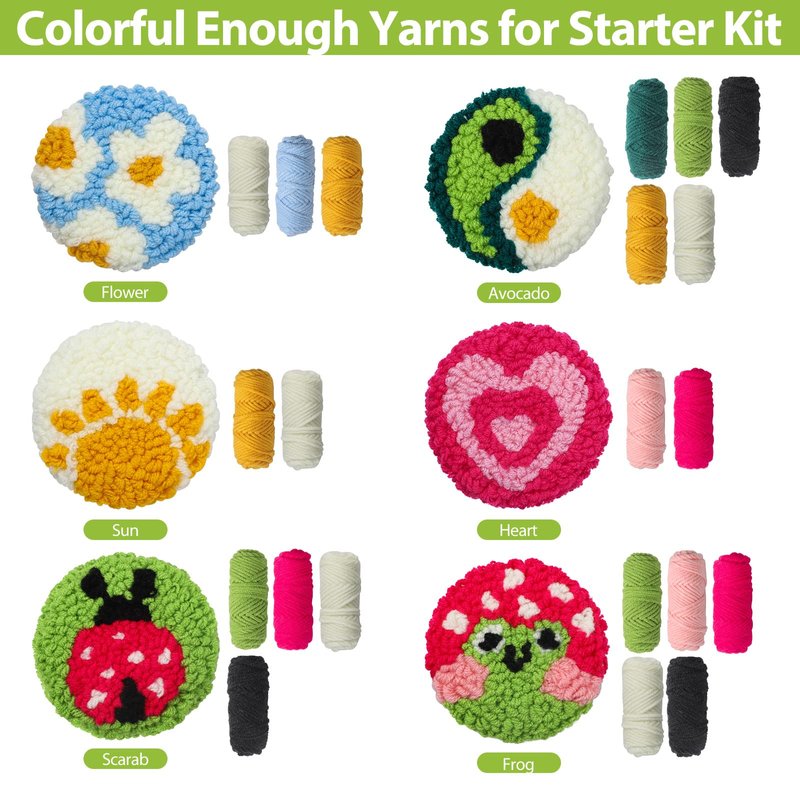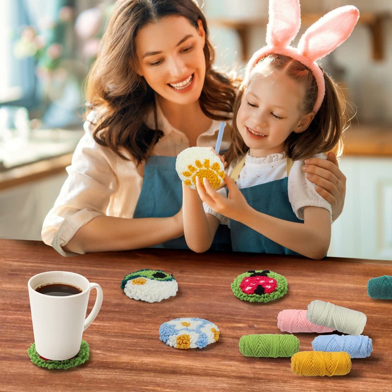 - 【Punch needle coasters kit for kids beginners】The punch needle kit for beginners contain 6pcs cloths with patterns, 6pcs adhesive felts, 1set enough colors cotton yarns, 1pc embroidery hoop, 1pc sewing thread,6pcs handle tools and 1 instruction, totally 22 pieces;The punch needle kits comes with everything you need to create beautiful coasters using a punch embroidery kit technique. The instructions are clear and easy to follow, even if you're new to the craft.