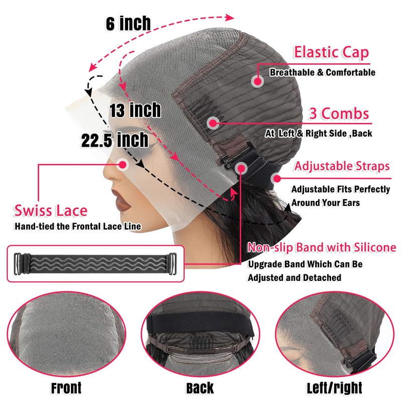 - Cap & Lace Size: 13x6 Body Wave Glueless Wigs Human Hair Average Cap Size (22-22.5 Inch) with Non-slip Band with Silicone and 3 Combs. Ear to Ear Transparent Lace. It Can Match Most People Perfectly, Can Be Side Part, Middle Part, Styled as Your Own Hair