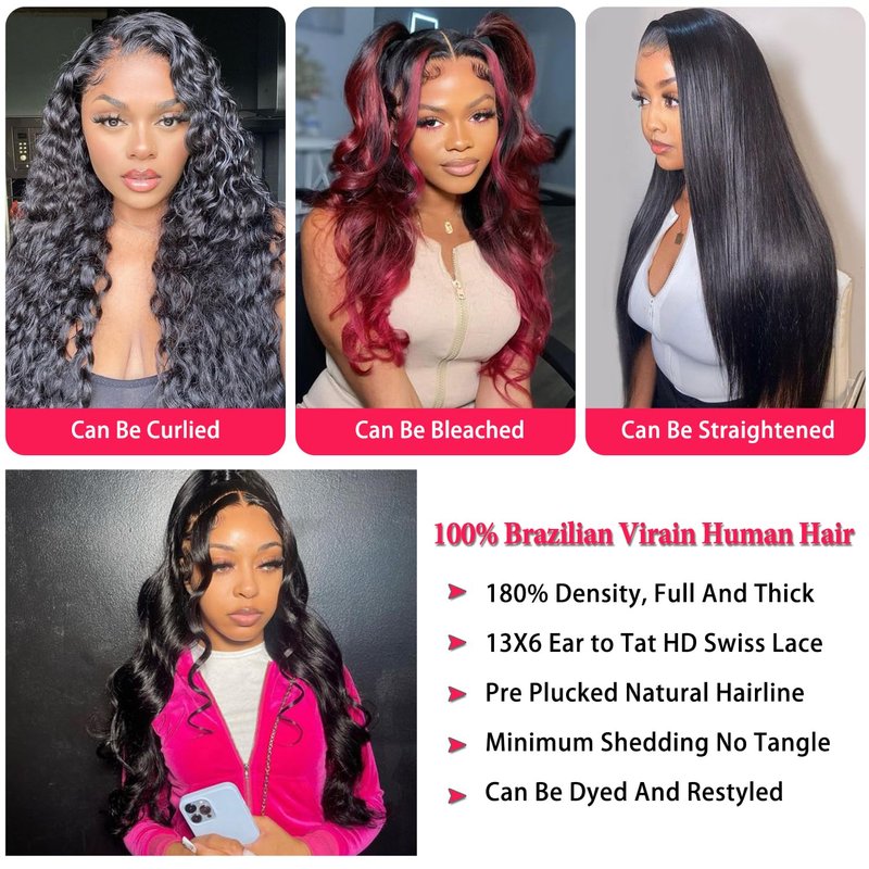 - 13x6 Lace Front Wigs Human Hair Material: 100% Unprocessed Brazilian Virgin Hair, Lace Front Wigs Human Hair, True to Length & Weight, Full & Bouncy, Soft & Natural. Can Be Dyed, Bleached, Straightened, Restyled. No Smell, Tangle & Shedding Free
