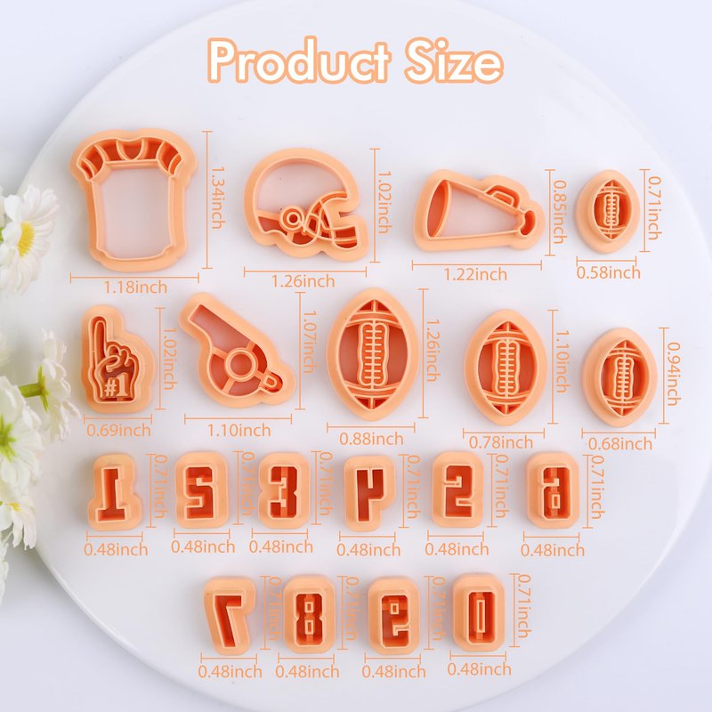 - Puocaon Football Clay Cutters: You will 19 pcs clay cutters for these football clay cutters set. There are 4 different size football clay cutters, number clay cutters from 0 to 9, and football uniform clay cutters etc.