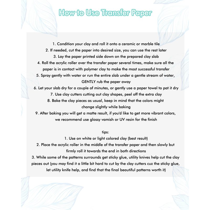 - Tips for Using Polymer Clay Transfer Paper: Cut off a small piece for try out if you are new to polymer clay transfer paper. Prepare a utility knife, it will help you cut off the clay pieces. Add uv resin after baking could add some flair to the clay earrings.