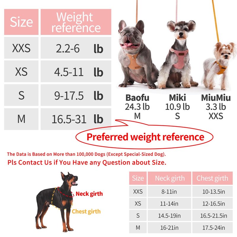 - No pull dog harness:No pull dog harness:Weight as low as 1.19 oz,undoubted ultra-light harness.Perfect tailoring design,patented rounded adjustment buckle,effectively protect the dog's bones and muscles during exercise to avoid injury.