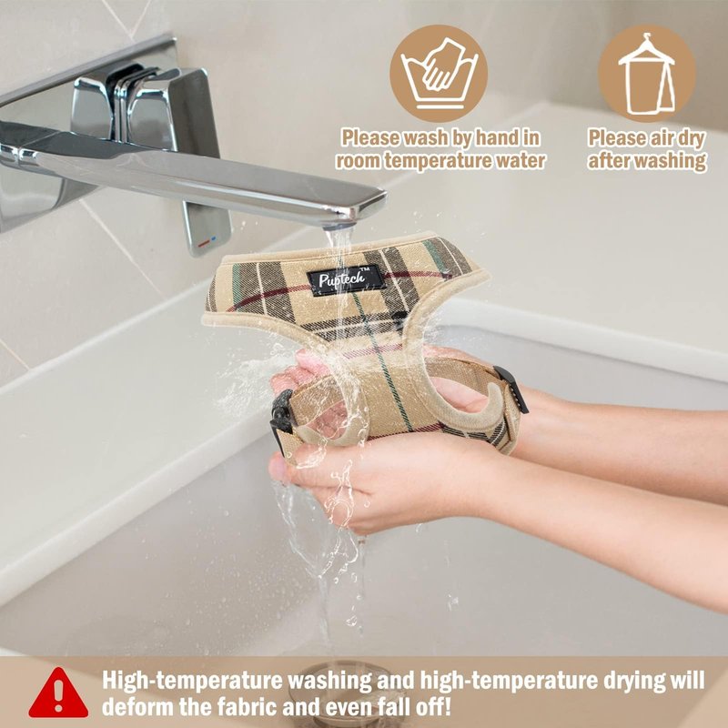 - [DIFFERENT DESIGN] - The harness is adopted with a plaid pattern which is designed by our internal brand team, so it's unique and very different from other normal harnesses. This plaid pattern looks both classic and stylish and is never out of date. It's great for everyday walking or going to a holiday party. It makes your furry friend look so lively and cute. Note that our plaid pattern is protected by design patent, so please DO NOT take risks!