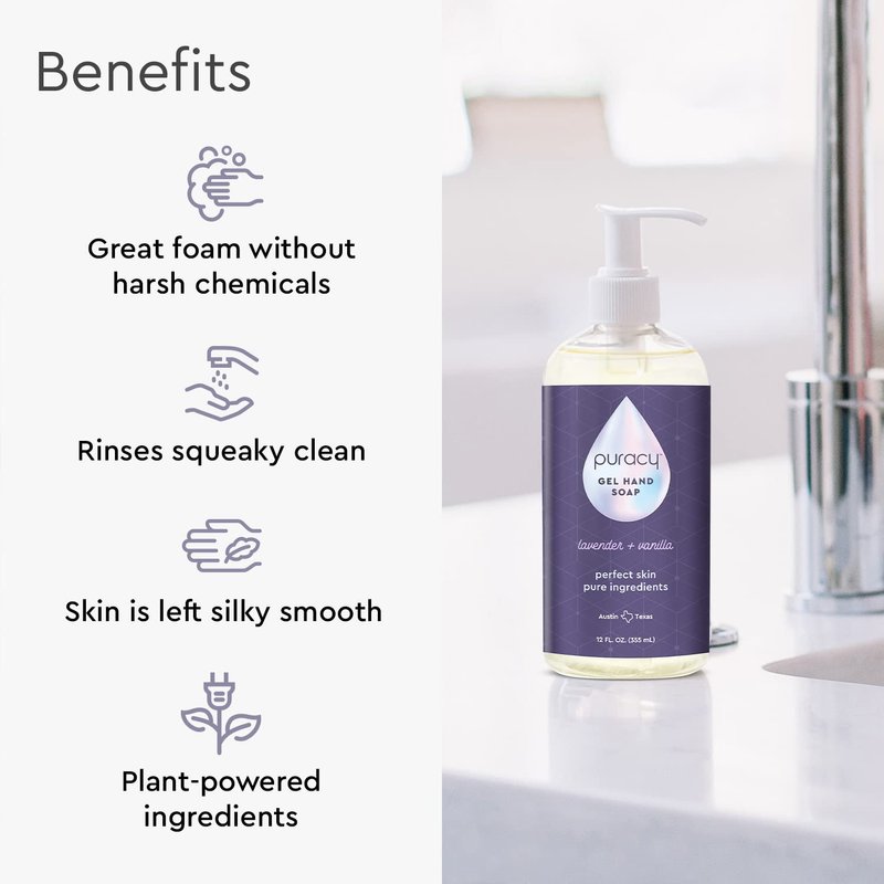 Puracy Natural Gel Hand Soap Refill (for liquid or gel dispensers, only) is a plant-powered liquid hand washing solution with a thick, honey-like consistency. It produces luxurious suds and feels gentle throughout the hand washing experience, yet still removes dirt and oil. This doctor-developed blend has an ideal balance of safe cleaners and vegetable-based skin moisturizers. The lavender and vanilla scent is from real essential oils and provides a gentle, balanced aroma throughout its use and then quickly disappears. The 64-ounce refill pouch contains enough concentrated soap to clean over 3000 hands. With such pure ingredients, we guarantee it to never clog your soap dispenser. The biodegradable ingredients were carefully chosen and developed into a premium solution by Puracy, a trusted source for natural, plant-based, child and pet-safe, hypoallergenic, and effective household essentials. This product is 99.09% Natural, per Puracy’s ‘What Natural Means to Us’ definition available on our website. The proprietary blend of renewable ingredients is safe to use around your family and does not contain harsh chemicals and fumes. The unique formula leaves no residues and provides a subtle aroma of lavender and vanilla. Our hand soap is tough enough for grease, gentle enough for children, and pure enough to naturally recycle in the environment.