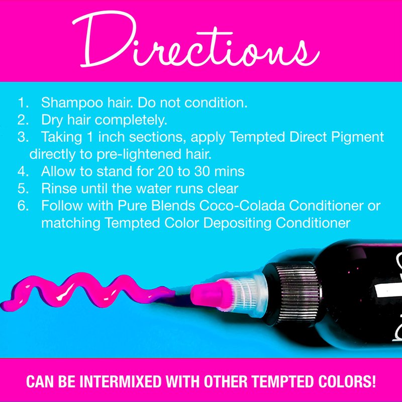 Unleash Your Creativity With Pure Blends Tempted! Hair Dye Designed to Deposit a Pure, Semi Permanent Pigment Into Your Hair. May Add Light Hues To Unbleached Hair. For Best Results We Recommend Pre Lightening Hair Before Use.