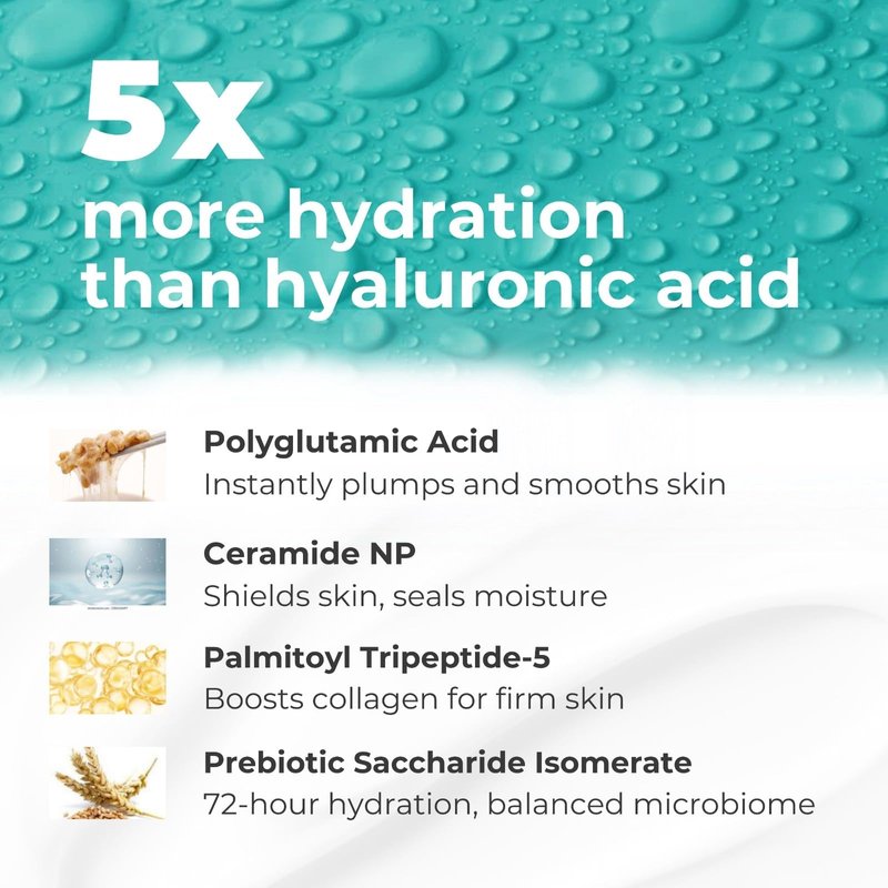 - POWERFUL BLEND of Polyglutamic acid, capable of retaining up to 5,000 times its weight in water, Ceramide NP, which mimics the natural lipids found in healthy skin, Saccharide Isomerate, a prebiotic ingredient that restores the skin's microbiome and provides intense hydration for 72 hours, and a variety of Omega-rich fatty acids derived from plant oils, to promote an overall healthy and vibrant complexion