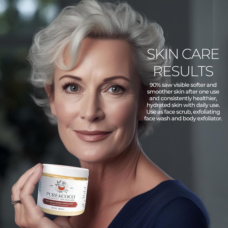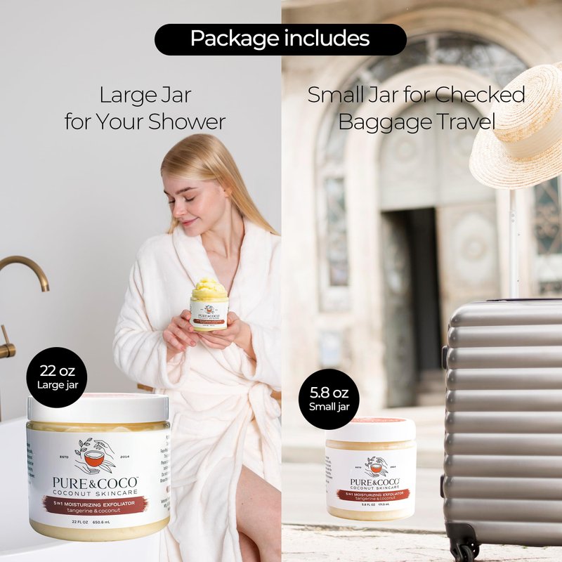 PURE & COCO personal care products: Turn dry, flaky, eczema skin into soft, smooth, and glowing skin naturally for the face & body. Nourishing ingredients gently buff away dull, dry skin, revealing a softer, smoother, and brighter complexion without stripping your skin of its natural oils. The results will leave your skin hydrated, nourished, and glowing for irresistibly smooth skin that lasts all day. Tiny cane sugar granules act as the multi-tasking exfoliator to gently yet effectively remove the dull, flaky skin and unveil the healthy smooth skin hidden beneath, preventing flare-ups. Brimming with antioxidant-rich, nutrient-dense organic cold-pressed coconut oil acts as an excellent moisturizer that hydrates nourishes, and soothes the skin.Results: Get ready to experience skin so moisturized nourished and irresistibly smooth skin to the touch. This bundle includes 1 large 22 oz jar for your shower, and 1 small 5.8oz jar for traveling or use in another bathroom. The combined weight is 27.8 oz total.
