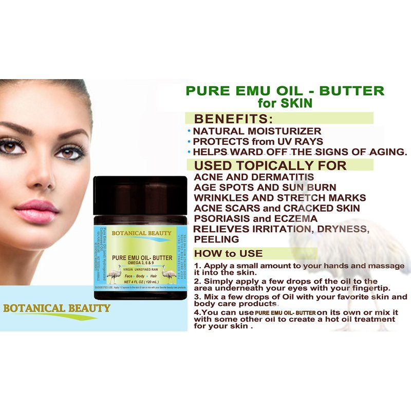 - One of the best raw butter to rejuvenate and regenerate skin tissues. PURE EMU OIL- BUTTER is rich in essential fatty acids a combination of omega 3 & 6 and 9, vitamins A & E ideal light moisturizer for everyday use. A Little Goes a Long Way, Absorbs Quickly, Not Greasy, Chemical Free, Not tested on Animals. DOES NOT CONTAIN ANY PRESERVATIVES