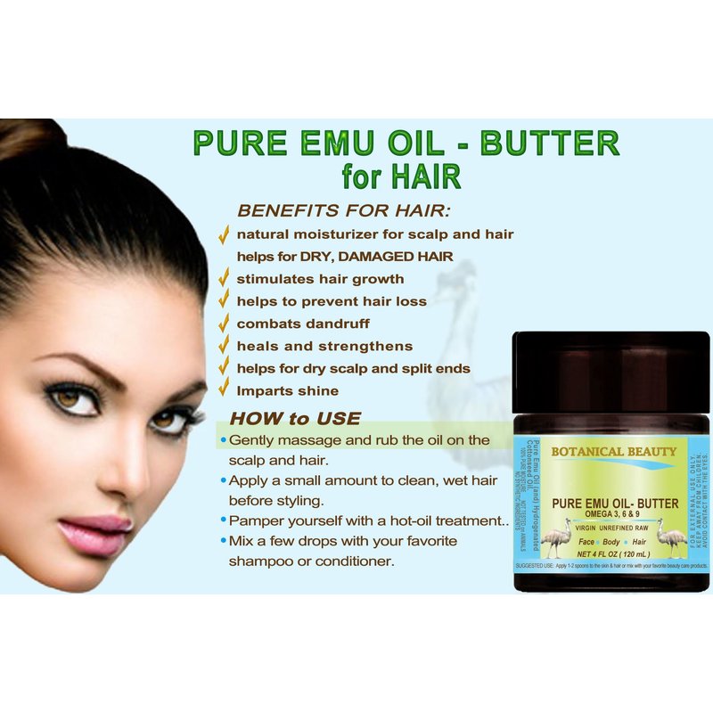 - PURE EMU OIL- BUTTER helps for DAMAGED HAIR, DRY SCALP AND BRITTLE NAILS. PURE EMU OIL- BUTTER promotes silky soft hair, prevents moisture loss and adds elasticity and suppleness, and also provides an immediate sparkle and shine, and helps to mend split ends.