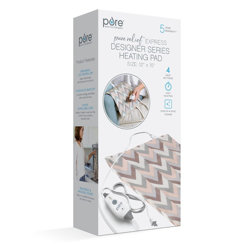 Relax and unwind with the PureRelief Express from Pure Enrichment. This electric pad provides a natural alternative to temporary pain relief with therapeutic heat. Easily and temporarily treat life’s common discomforts, like cramps, back aches, and sore muscles with this soft and durable pad. Choose from 4 fast-heating temperatures providing comfort to your lap, back, chest, or shoulders. Enhance relaxation in any setting with this pad at home, school, or work. ・One-of-a-Kind Design: Made with a designer series cover that's long-lasting and non-irritating to sensitive skin ・4 Heat Settings: Choose the level of warmth that works best for you with settings that range from 110℉ to 140℉ ・Automatic Shut-Off: Convenient 2-hour shut-off conserves energy and ensures your pad never overheats ・Extra-Long Cord: A 9-ft cord makes using this pad on your bed, couch, or favorite chair a breeze ・Machine-Washable: Keep your pad looking as new as the day you purchased it by machine washing the cover when needed