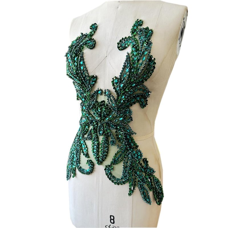 Pure Handmade Rhinestones lace Applique Accessories handsewing Beads Stones Trim Patches for Girl Wedding Dress (Deepgreen)