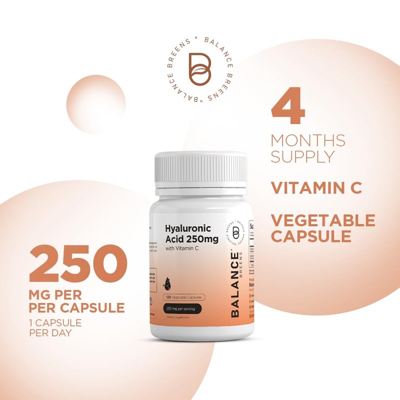 Discover the ultimate capsule for radiant, youthful skin with Balance Breens Hyaluronic Acid with Vitamin C Supplement. Our triple strength formula combines the power of hyaluronic acid and vitamin C to provide unparalleled hydration and collagen support. Crafted with pure, high-quality ingredients, these organic pills offer premium nutritional benefits for women and men alike.