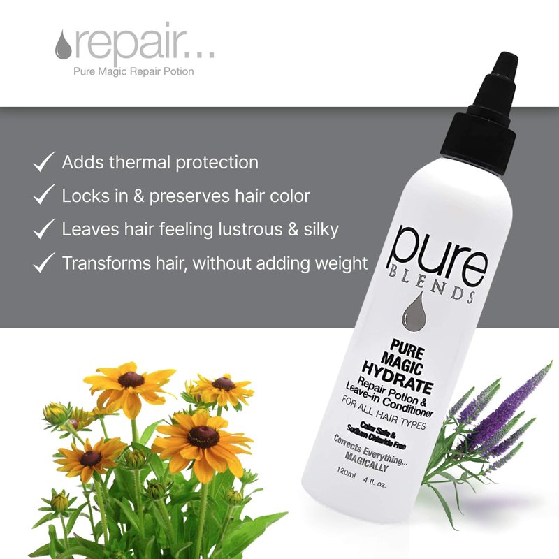Pure Magic Hydrate Repair Leave–In Conditioner Detangler & Heat Protection Styling Lotion Repair/Reduce Breakage & Split Ends Color Safe & Sodium Chloride Free 4 Oz.