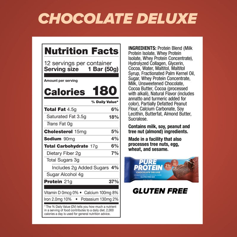 - DELICIOUS HIGH PROTEIN BAR: Pure Protein Chocolate Deluxe Bars are full of flavor and contain 21g of protein for lasting energy. Each delicious bar is gluten free with high-quality protein that helps build lean muscle and strength.