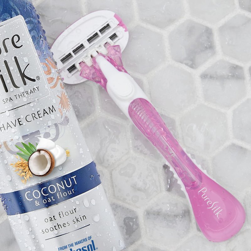 For legs that look, and feel, like pure silk, try Pure Silk premium disposable razors. Each Value Pack Bundle includes nine (9) Contour 6 Premium Disposable Razors. The Contour 6 Disposable Razor, features a unique Double-Flex Head that flexes and adjusts to every contour of your body. Our Pure Silk Promise on the Contour 6 Disposable Razor is ultra thin, open flow blades that allow for easy cleaning and long blade life. Dual moisture bars infused with aloe calm and protect skin. A comfort grip handle on the Pure Silk Contour 6 Disposable Razor ensures a smooth, clean shave. It’s time you enjoyed the effortless shave you deserve. For a smooth and moisturizing shave, pair with Pure Silk Shave Cream.