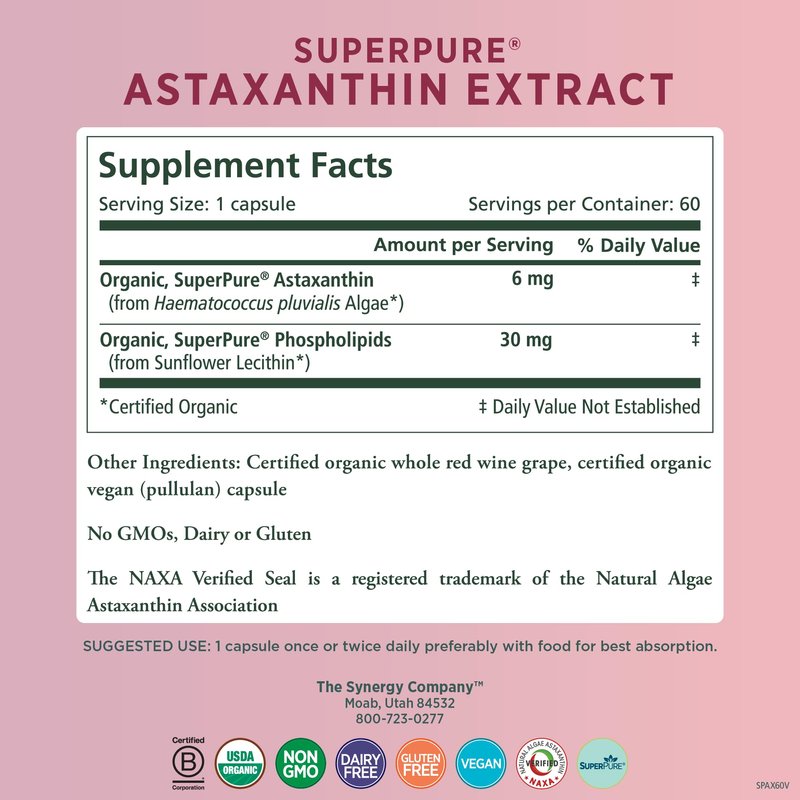 PURE SYNERGY SuperPure Astaxanthin Extract | Organic Astaxanthin Supplement | Vegan Astaxanthin from Algae with Sunflower Lecithin | Antioxidant Support for Skin, Eye, and Joint Health (60 Capsules)