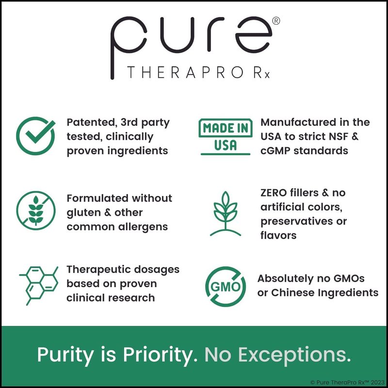 - ABOUT US: Pure TheraPro Rx was founded in Denver Colorado to formulate and manufacture the highest quality supplements available on the market today. Purity is our priority, which is why we insist on using patented, clinically studied ingredients, and never utilizing fillers, flow agents, excipients, or ingredients sourced from China. We also never use dairy, gluten, corn, soy, or other common allergens in any of our class-leading, practitioner-recommended formulas.