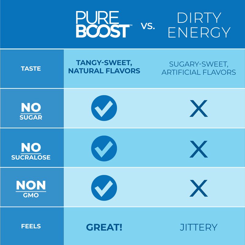 Up to 6 hours of powerful clean, immune boosting energy* now packed with 28 vitamins, minerals and supernutrients like Elderberry, 1200mg of Vitamin C, Vitamin D, Vitamin A, Selenium and Zinc! Powered by natural green tea caffeine and B12. Electrolytes for rapid hydration. Made with the natural ingredients you expect from Pureboost.