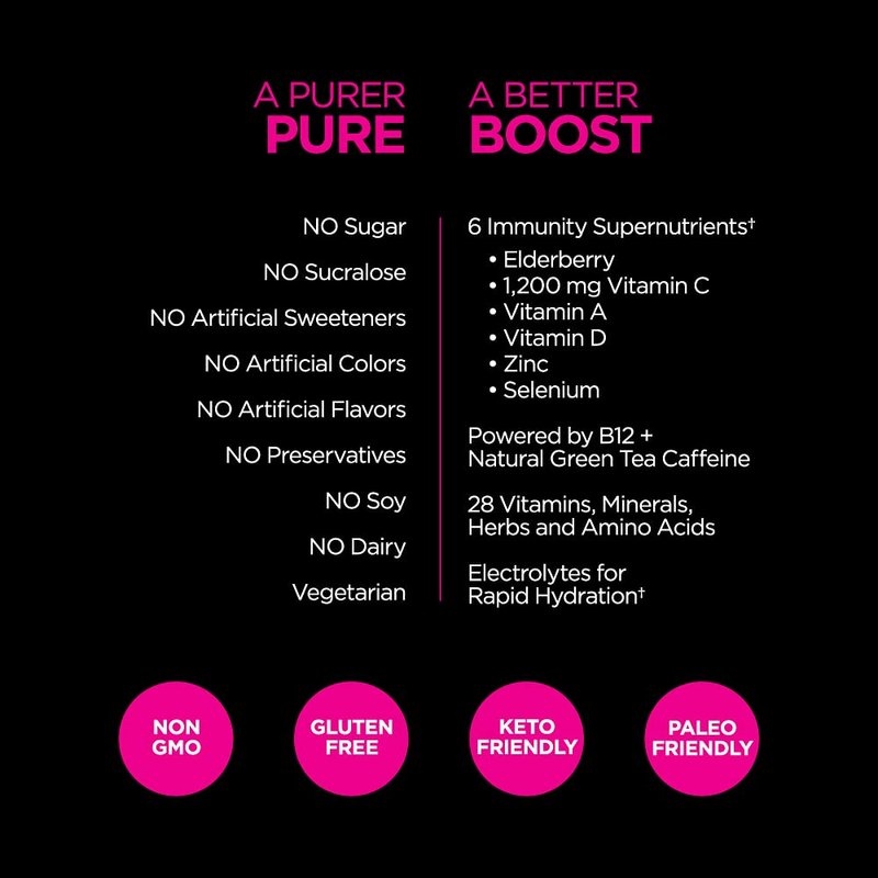 Up to 6 hours of powerful clean, immune boosting energy* now packed with 28 vitamins, minerals and supernutrients like Elderberry, 1200mgs of Vitamin C, Vitamin D, Vitamin A, Selenium and Zinc! Powered by natural green tea caffeine and B12. Electrolytes for rapid hydration. Made with the natural ingredients you expect from Pureboost.