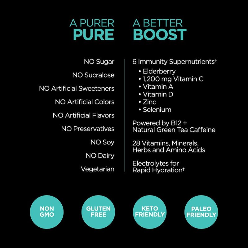 Up to 6 hours of powerful clean, immune boosting energy* now packed with 28 vitamins, minerals and supernutrients like Elderberry, 1200mgs of Vitamin C, Vitamin D, Vitamin A, Selenium and Zinc! Powered by natural green tea caffeine and B12. Electrolytes for rapid hydration. Made with the natural ingredients you expect from Pureboost.